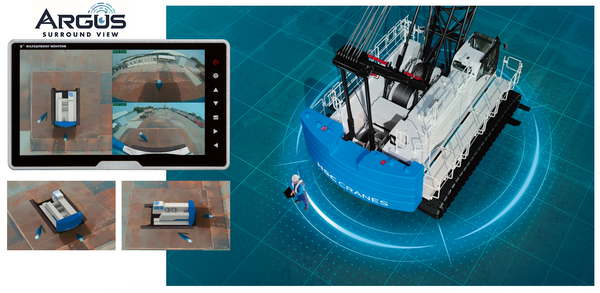 今回のマイナーチェンジでは、作業に関わる人を大切に守る、きめ細かな安全への配慮として、視認性を高めたタッチ式大型ディスプレイの採用と、情報量を拡充した新型過負荷防止装置(M/L)を搭載したほか、自閉式ゲートバーを採用したハンドレール付キャットウォークや、機械周囲の安全確認をサポートする周囲監視システム 「ARGUS🄬(アルゴス)」を設定するなど、クレーン本体周りへのアクセス性と作業の安全性を向上させました。
