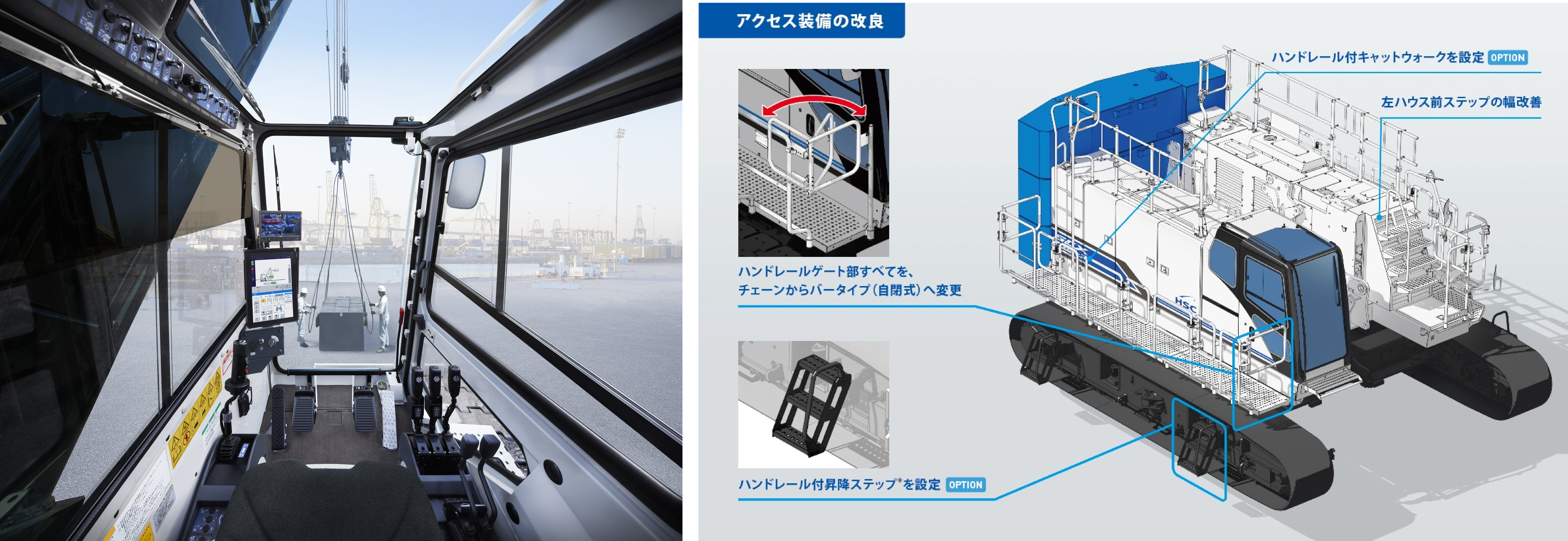 ② 自閉式ゲートバーを採用したハンドレール付キャットウォーク(オプション):ハンドレールのゲート部を、従来のチェーンから自閉式バータイプにするとともに、ハンドレール付昇降ステップをオプション化するなど、クレーン本体へのアクセスも向上させました。