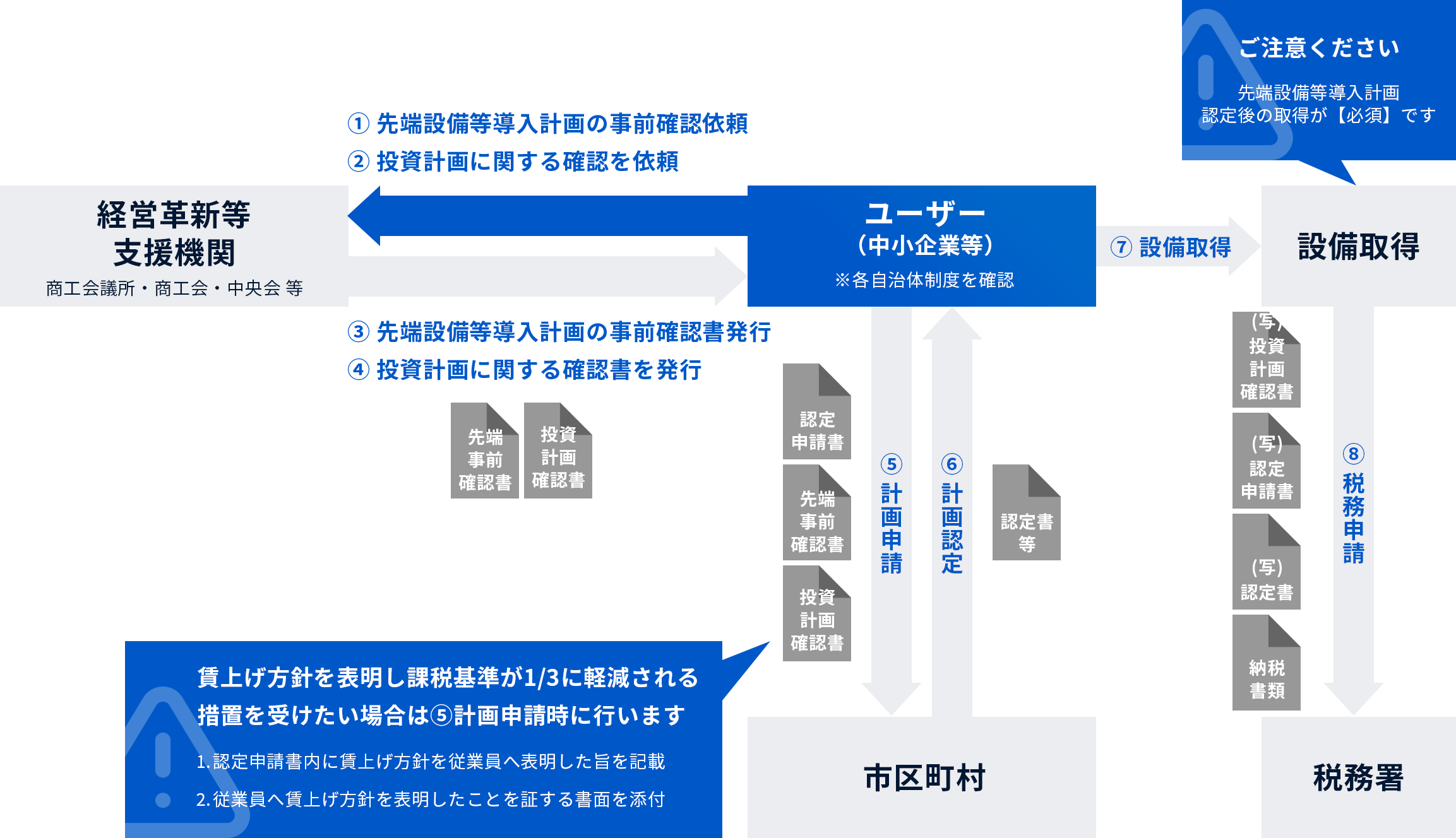 税制措置を受けるには、ユーザーが計画申請書を作成し、購入予定の機械装置が税制対象である事の証明書(工業会発行)と共に提出し、認定される必要があります。