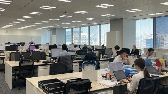 本社には総務や経理など管理部門だけでなく、各地の営業所や工場との橋渡し役を担う企画部門や業務部など多様な部署が集まっています。海外営業・サービス部門では英語が飛び交い、企画部門や管理部門では国内拠点からの問い合わせに電話やWeb会議で対応するなど、活気に溢れた職場です。